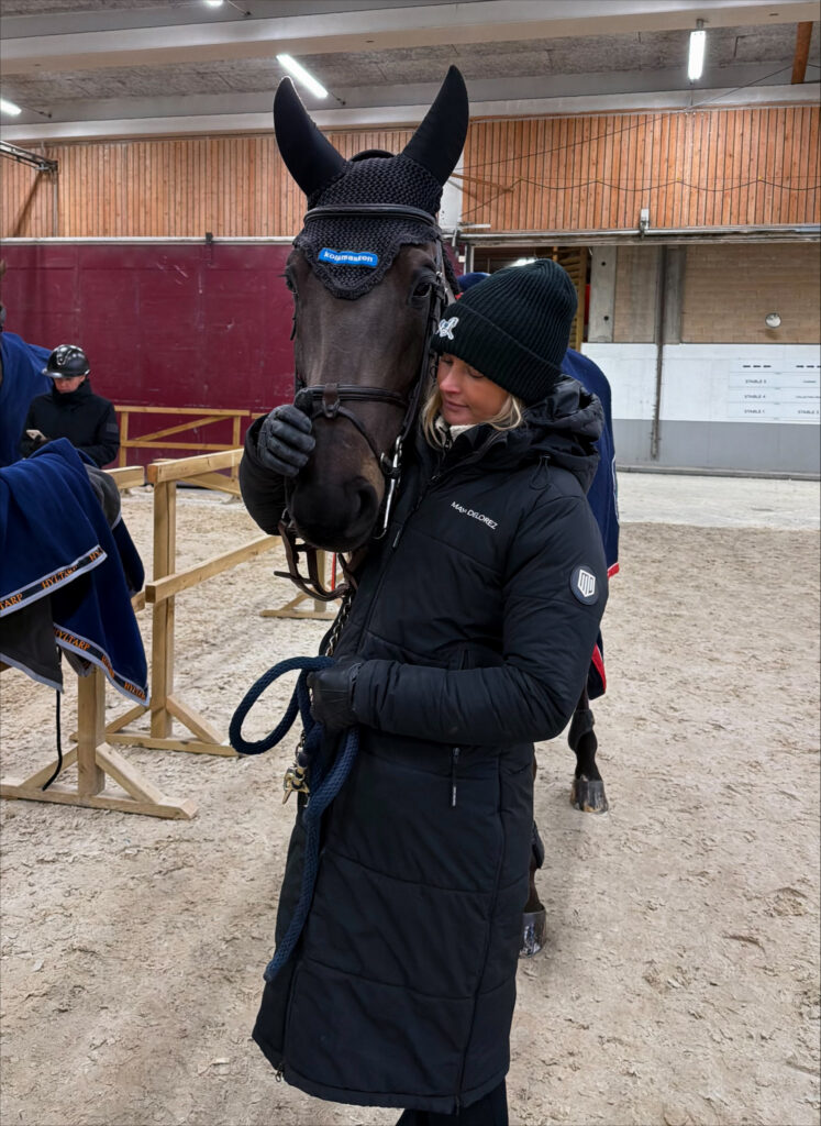 Vi var “uppe med tuppen” även på onsdagen för att fodra och rida ett trimpass inne på arenan innan start vid kl. 13.