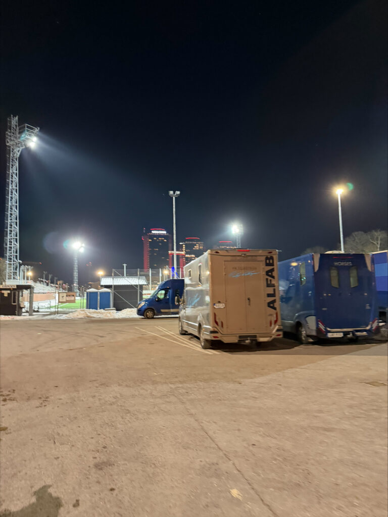 Väl på plats i Göteborg, närmare bestämt Valhalla IP där de nationella hästarna stod uppstallade, blev det en stunds kö innan vi fick komma in på stallområdet. Där var Länsstyrelsen och gjorde en “rassia” och kollade att alla tillstånd för hästtransport fanns i ordning. Allt var som det skulle, så det gick snabbt.